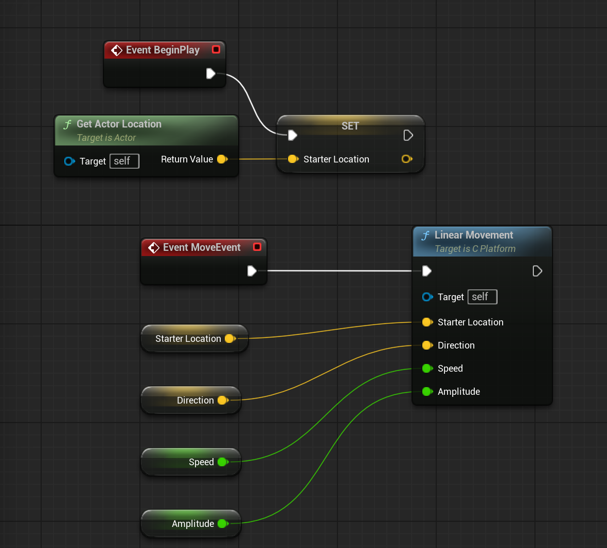 Starter Location을 Get Actor Location과 연결하여 Set -> BeginPlay로 시작 위치 설정