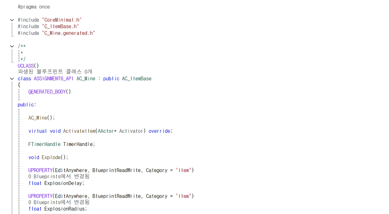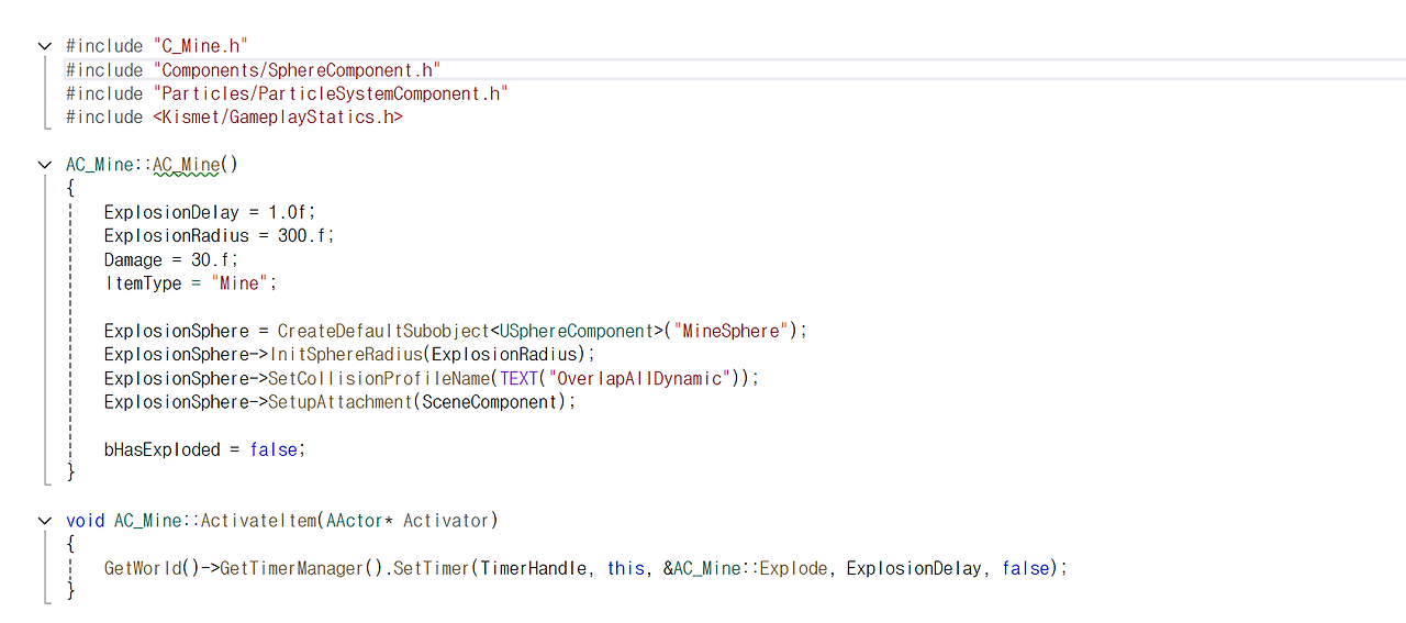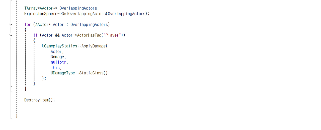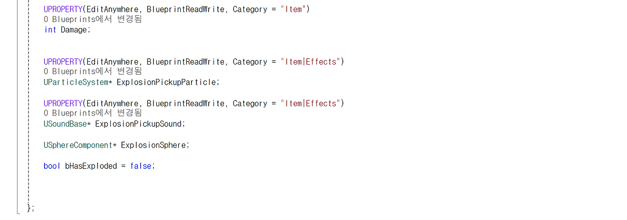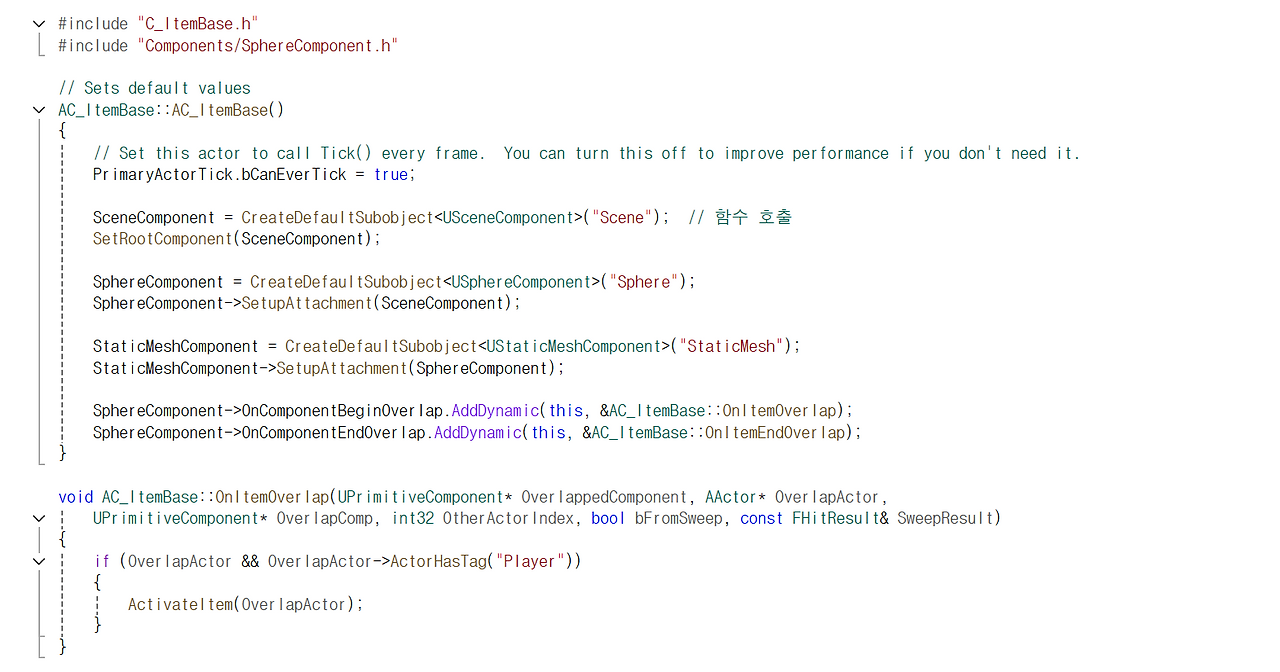 - StaticMesh, Sphere(범위), Scene, ItemType 변수, 아이템 사용 후 없애기 위한 함수 DestroyItem().