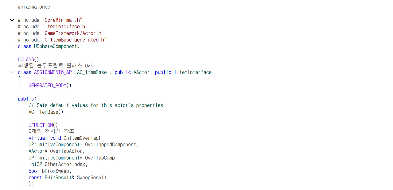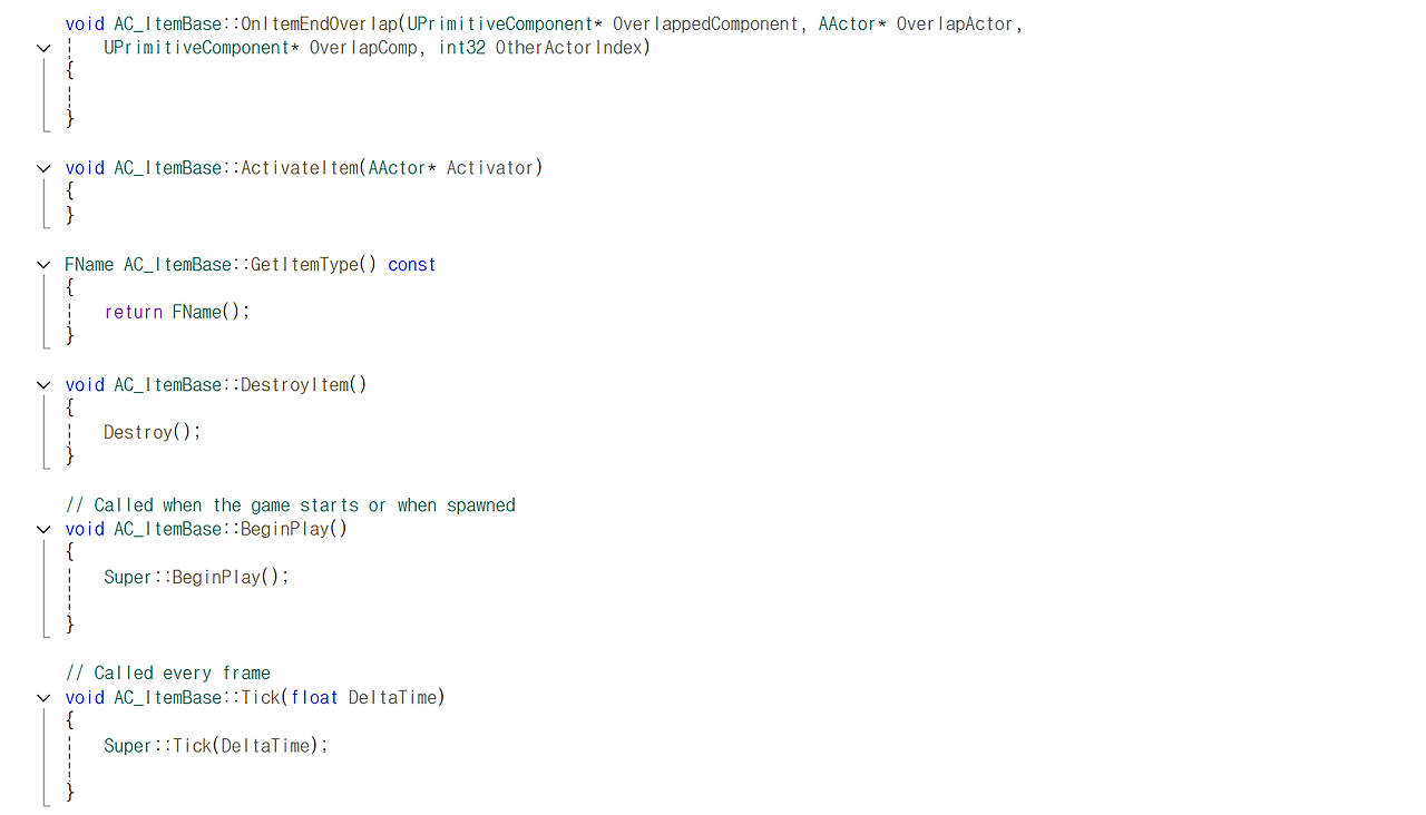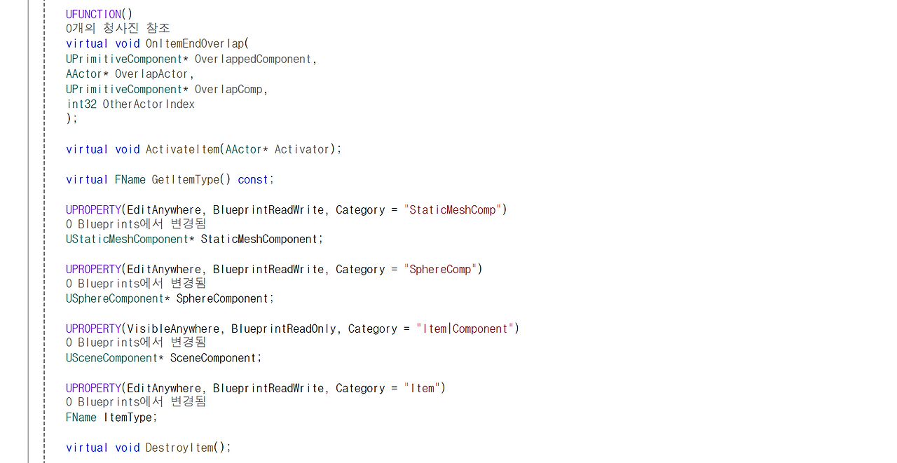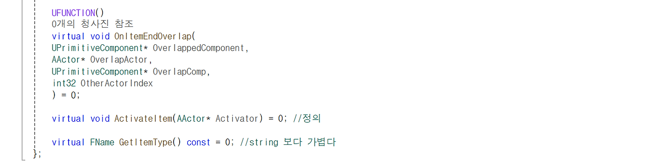 - C_ItemIterface.h에서 겹칠 경우의 함수 OnItemOverlap()과 겹친 이후의 함수 OnItemEndOverlap(), 아이템 활성화 ActivateItem(), 아이템 형태 GetItemType()를 순수가상함수로 구현.