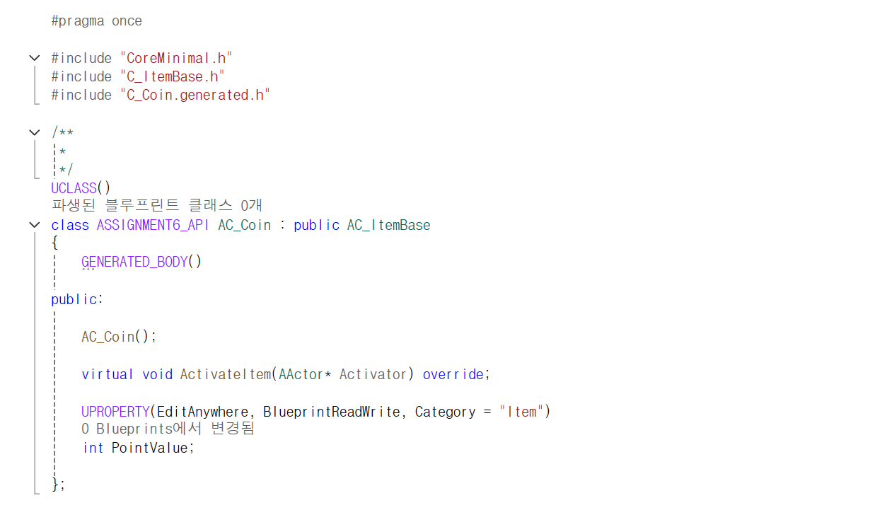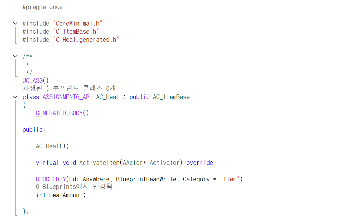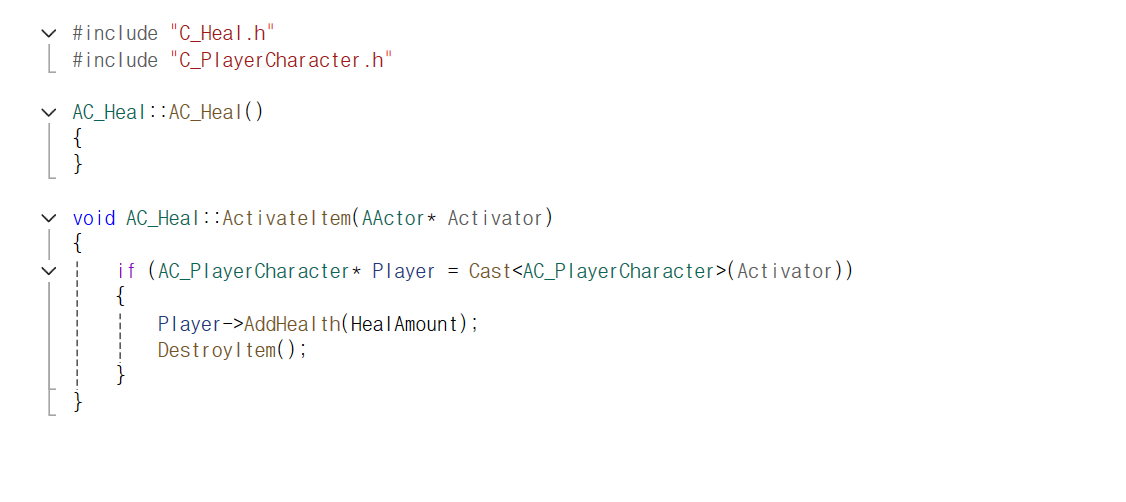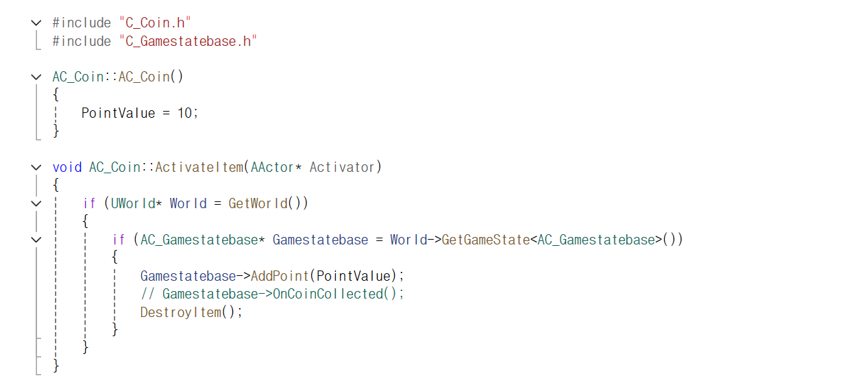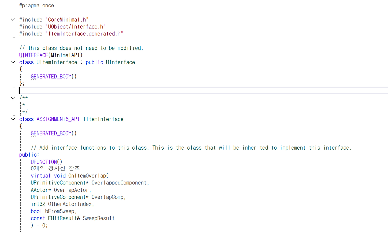- C_ItemIterface.h에서 겹칠 경우의 함수 OnItemOverlap()과 겹친 이후의 함수 OnItemEndOverlap(), 아이템 활성화 ActivateItem(), 아이템 형태 GetItemType()를 순수가상함수로 구현.