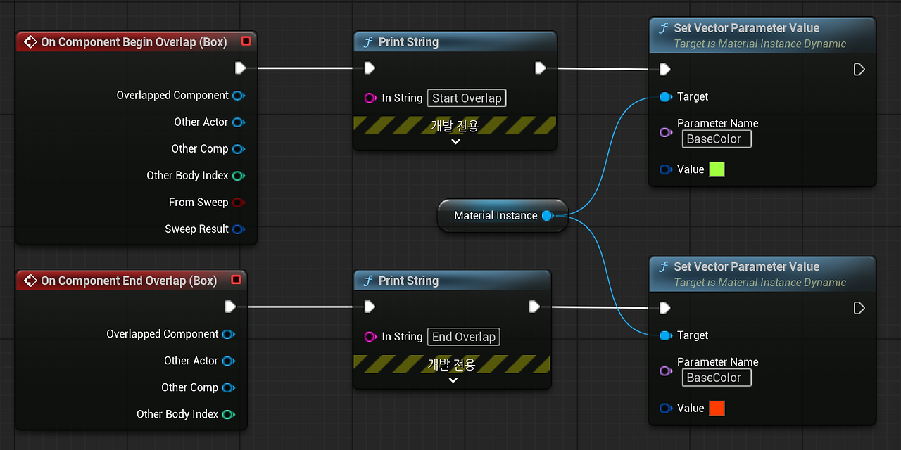 Material Instance에서 Set Vector Parameter Value로 Parameter Name에 바꿀 파라미터(BaseColor) 이름, Value에 변경할 값 입력