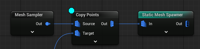 Copy Points의 Target에 배치한 Static Mesh의 노드를 연결하고, Copy Points를 Debug 한다.